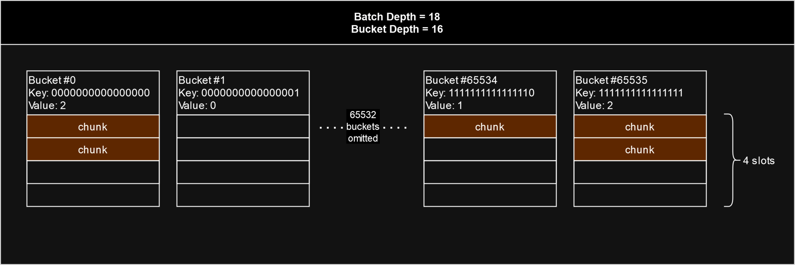 In the diagram below, the batch depth is 18, so there are or 4 slots for each bucket. The utilisation of a batch is simply the highest number of filled slots out of all 65536 entries or "buckets". In this batch, none of the slots in any of the buckets have yet been filled with 4 chunks, so the batch is not yet fully utilised. The most filled slots out of all buckets is 2, so the stamp batch's utilisation is 2 out of 4.